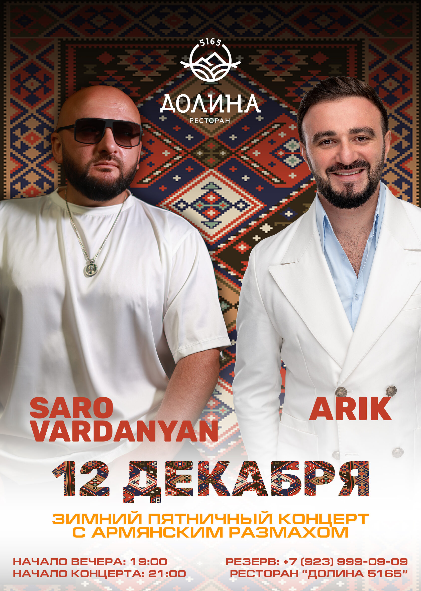 Друзья, приглашаем вас на настоящий праздник души — концерт любимых артистов Саро Варданяна и Арика в ресторане «Долина 5165».