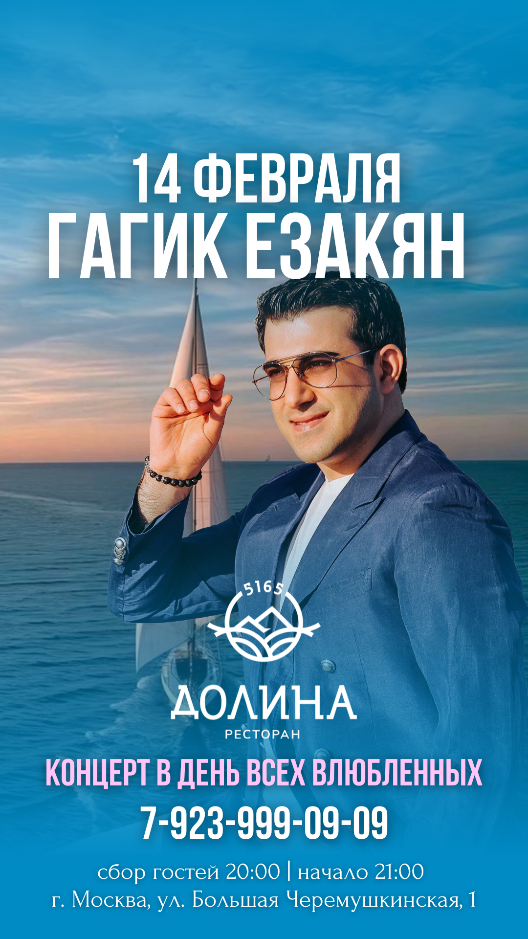 14 февраля 2026 в ресторане «Долина 5165» состоится концерт потрясающего певца: специально для вас любимые песни будет петь Гагик Езакян